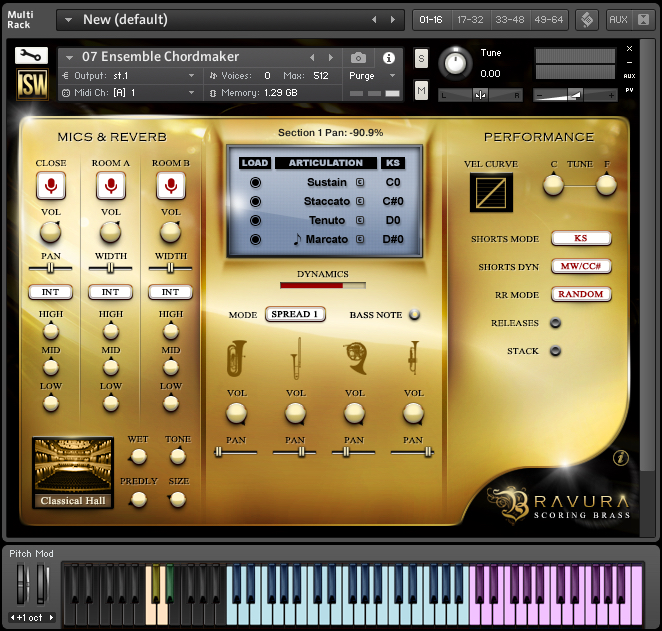 The most important controls on Bravura Scoring Brass end up being the dynamics and vibrato sliders. By default the dynamics are controlled via the mod wheel, but you can always re-assign it to another MIDI CC. There’s also a default control option set for using a MIDI breath controller if you happen to own one. Because the MIDI keyboard velocity doesn’t affect the dynamics slider, it becomes much easier to control articulation through MIDI note velocity, by switching the previously mentioned performance control option on. Because I’m used to playing and recording parts directly into an audio workstation, this proved to be my favorite set up when using Bravura.