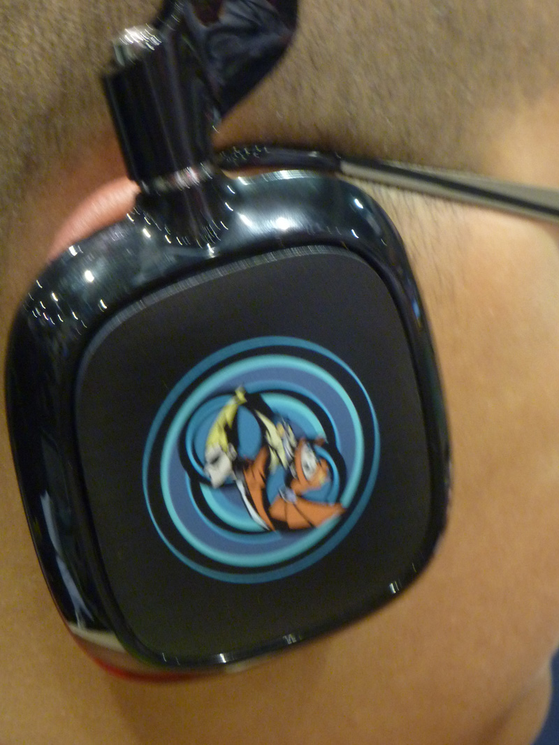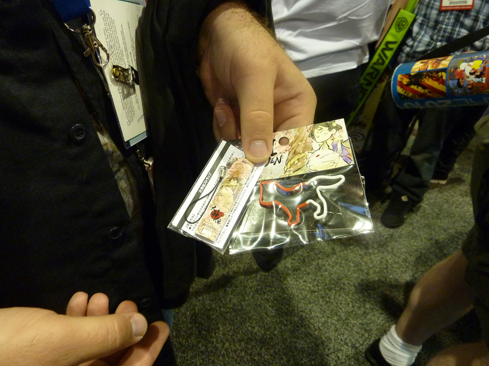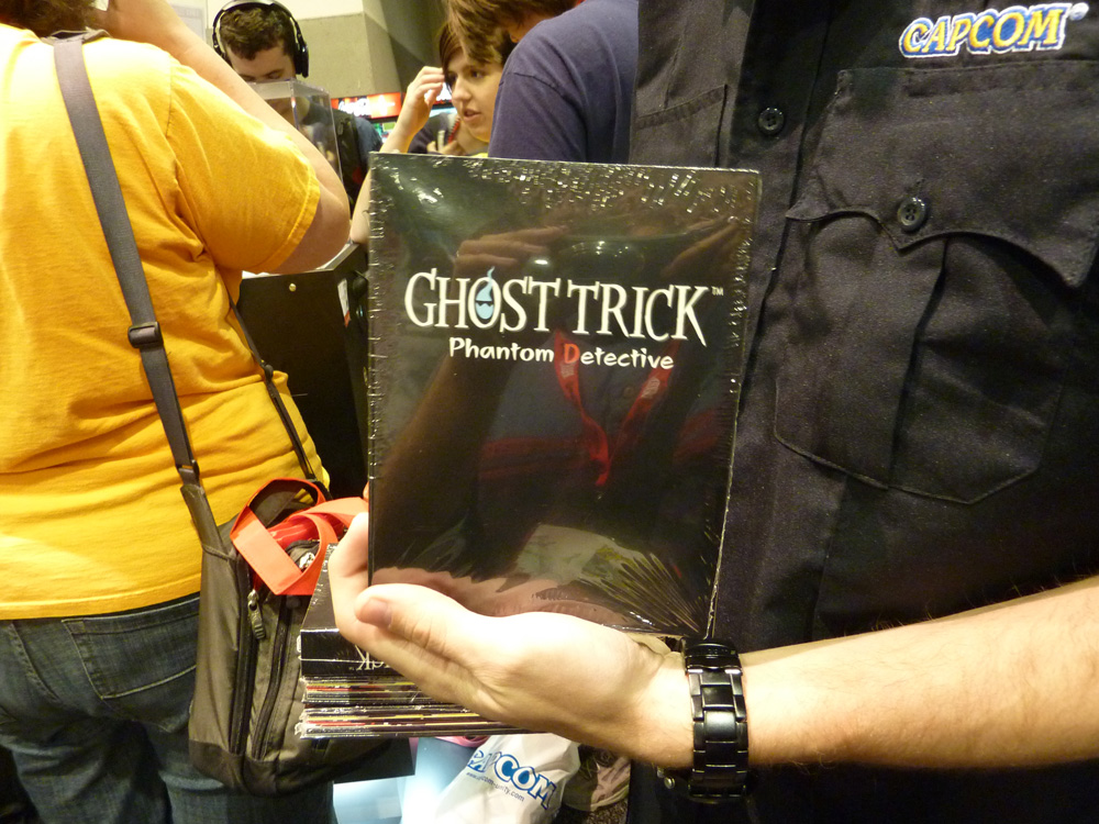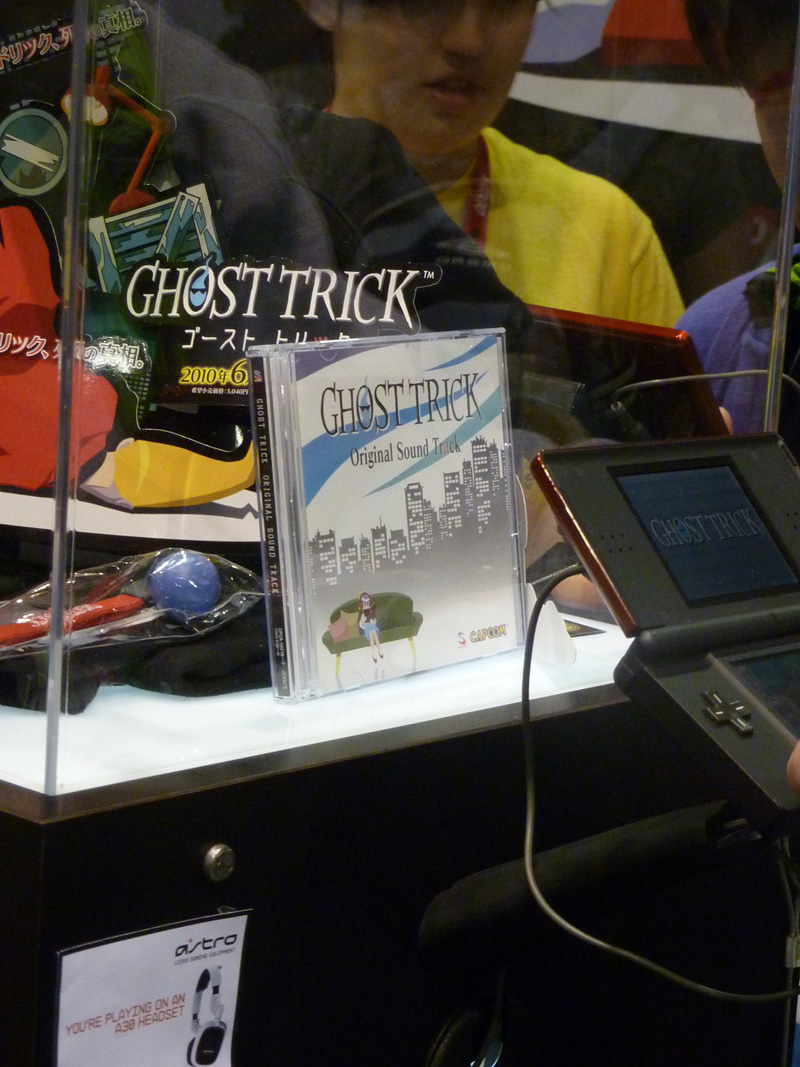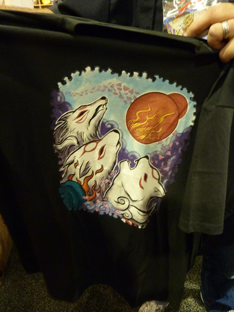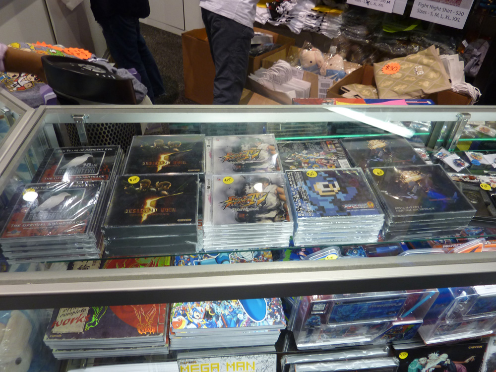 Most interesting, however, is the Capcom store that has videogame soundtracks on sale (mainly the US-printed Sumthing Else versions) and the unique Okamiden and Ghost Trick headphones that can be used while playing the games. These headphones are actually Astro Gaming headsets that have the paneling swapped out, but they’re still cool. We’ve also photographed some of the cool swag Capcom is handing out, including an awesome Okamiden “wolf howling at the moon” T-shirt.