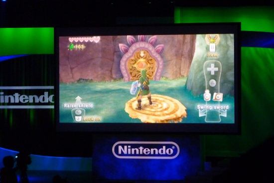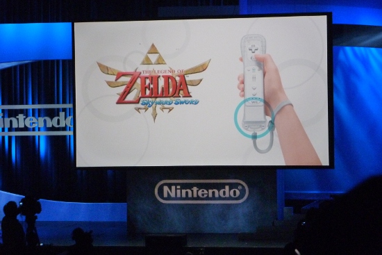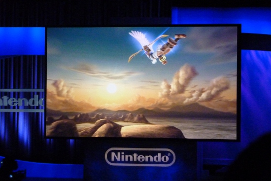 The first title shown was The Legend of Zelda: Skyward Swords, which is a new Zelda title for the Wii using the Wii MotionPlus for realtime sword combat as well as shield and item use. The demonstration started with a feed of Miyamoto on screen talking about the game with the Zelda fairy music in the background. He was looking down and giving directions to his translator on stage who was demoing the game, and with the music, it was pretty comical as he floated above like a magical being. Regarding the music, we heard two pieces in the demo, including an epic orchestral trailer piece that worked in the series’s iconic theme. The in-game track, however, really stood out for its somewhat mature fantasy RPG sound. It didn’t sound like the typically playful Hyrulian training area that I would have expected, and has me wondering what else we’ll be hearing in the game.