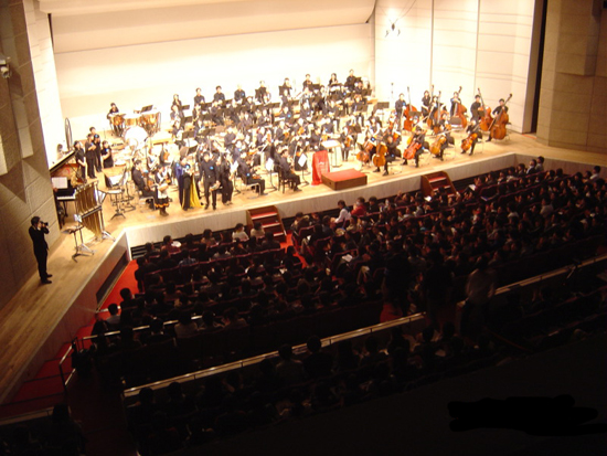 The “orchestra” behind the performance is called “Hoshi no Shirabe” or “Hoshirabe” for short. They’re a fairly young (college-age) amateur volunteer group that were all gathered up on Mixi, a Japanese social networking site, over the past couple years. This is actually their second concert, but this is their first-ever orchestral performance. Every member of the group had blue flower (carnation?) on their lapel or in their hair somewhere. The standard orchestra instruments, including violin, viola, cello, and piano were present. But other unique instruments were also included, like the xylophone, a gong, several different drums, a triangle, and concert tubular bells which demonstrated that they were going to try to be as accurate as possible in reproducing the sounds from the game.