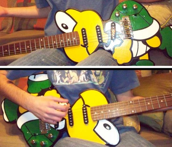 I remember Dale posting about a crazy-ass guitar from Japan that came with a built-in sword, some gruesome eyeballs, and a terrible color scheme. While this custom made Koopa Troopa guitar isn’t nearly as bizarre, it’s certainly cool, and would have fit right in with the bands that performed at MAGFest last week.
