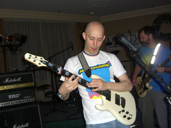 Metroid Metal, as I said earlier, is led by Grant Henry. He created many of the arrangements for the project, and on stage, he plays rhythm guitar (he’s one of three guitarists on stage). Watching him perform, it’s clear he’s the “level head” of the band. He always looked cool, confident, and in control. Compare that to lead/solo guitarist Danimal Cannon, or as I like to call him, the “loose cannon.” He is likely the most technically talented performer of the bunch. But his stage presence is just crazy. He would smile, and make funny faces, during these complicated solos. He was spot on for almost everything: the only slip-up I heard from him was in the impossibly difficult melodic line in “Kraid.” Even the recorded version of that track isn’t without flaw, so I guess I shouldn’t have had my expectations set so high for the live performance.