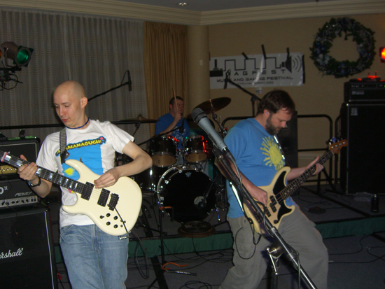 Metroid Metal was a studio-exclusive project until MAGFest 7 (last year), when they made their live concert debut. They were a surefire hit, and thus, they came back for MAGFest 8. And man, they wiped me out. Let me tell you, I was having convulsions over this show. As a rule, I always wear earplugs to concerts, but I was sorely tempted to take them out during the Metroid Metal show. In fact, I did take them out for the encore. I may now go deaf before my kids graduate from high school, but it will have been worth it.
