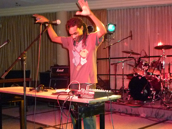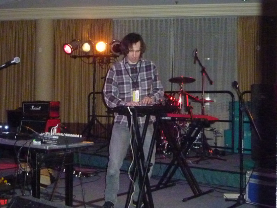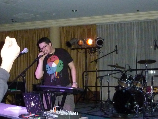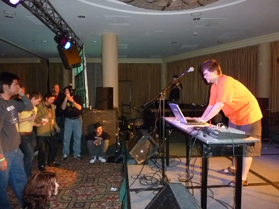 Our friend virt then took to the stage wearing shorts and some awesome rainbow-colored socks. As promised, he came with a keyboard this time as opposed to his DJ set on New Year’s Eve. His set was of course brilliant. He went from funky chip goodness, to Chinese-inspired material ala Autumntunes, to 8-bit Michael Jackson with “Thriller,” to some awesome raggae goodness with Priest Cave, a duo of virt and Dan “Prozax” Orosz. I’d never heard Priestcave’s music before, so this was much appreciated. Jake also brought out music from his most recent videogame project, the upcoming Shantae on the DSiWare, playing three tracks that were all a lot of fun. He also included his Dragon Spirit 80s/chiptune arrangement, featuring Jake himself on vocals, which was completely awesome. He ended the set DJing tracks from the rising chiptune star, Coda, who we also talked about in our Autumntunes review, and I can’t agree more that the super-upbeat sound he creates are absolutely amazing.