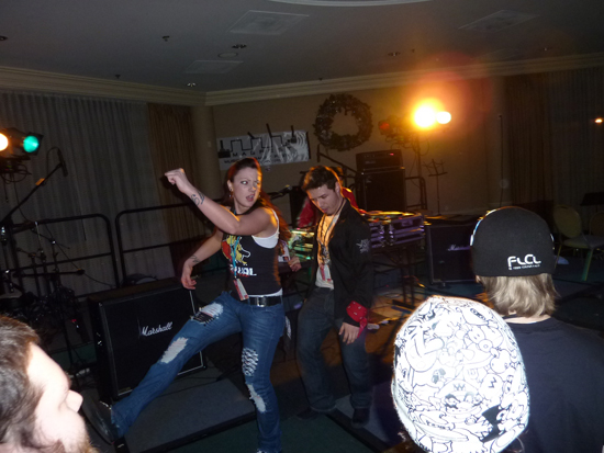 It wasn’t all bad, as I mentioned the two tracks above were strong, and my favorite track of theirs of the night, “Persona,” kicked some serious ass and sounded great. However, many tracks I was looking forward to the most, including “Moon Stage” from Ducktales (which is one of the greatest songs ever), “Tyrano Lair” from Chrono Trigger, and the Katamari Damacy theme all suffered. Ducktales wasn’t terrible, but there were some missed notes. I admit it is a complex song, but it was a shame that they weren’t sounding their best. “Tyrano Lair,” on to other hand, was almost unlistenable with all the feedback and blurring of sounds. When Katamari Damacy came around, Mustin and Joe Cam (who earlier had prepared and served Swedish meatballs from a table at the back of the room, courtesy of The Smash Brothers) came to the stage to sing the main theme, injecting some great jokes about Dwelling of Duels and Snappleman, but at this point the guitarist set his guitar down entirely and tried multiple times to crowd surf. Needless to say, this didn’t work so well with a crowd of nerds in front of the stage, and he tried and failed numerous times. I suppose it was funny to watch him, but it was at the expense of the music.