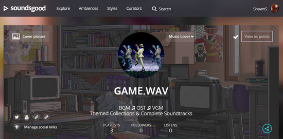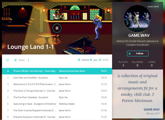 Galway to the Galaxy highlights Martin Galway’s Commodore 64 work which is almost completely foreign to me. Bit-nique is an eclectic collection of SNES, PC and arcade favorites from the 90’s. Chiptune Porn is a huge playlist full of the usual suspects and BAGARRE features 90 tracks from one-on-one fighters and character action games. If I may be so bold, I’ll include my own playlist I made while checking out the site for this post. Lounge Land 1-1 is a collection of original pieces and remixes with a jazzy lounge vibe. It’s a playlist I’ve been meaning to make for a long time and Soundsgood gave me the motivation to finally do it.