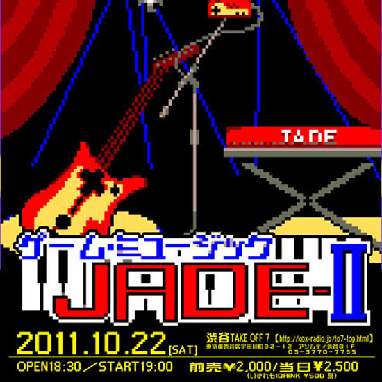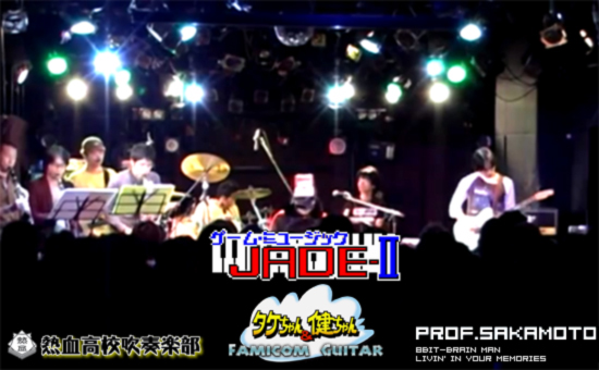 JADE-I took place on 26th of March at BUNGAJAN in Asakusabashi, and proved to be a success. So Kunimoto started plans to continue the name with another event, JADE-II. For this event, several new names were added to the lineup. Nekketsu High School Brass Band, a young upstart woodwind and brass performance group performing classic Famicom soundtracks. Kunimoto’s Take-chan & Ken-chan band, with guest vocalist AKIRA hagiwara and guitarist Tendo, and last the extremely popular variety performer Professor Sakamoto. To a sold out crowd, JADE-II took place on 22nd October.