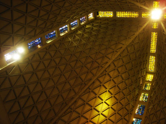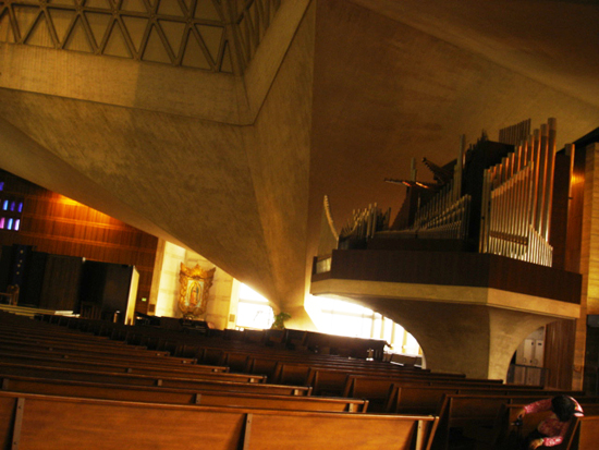 Well, as my wife and I walked the long distance to Japantown (I do a lot of walking in SF because I’m too cheap to pay for a cab), we passed the visually impressive St. Mary’s Cathedral on Geary and Gough, which stands as a giant tower surrounded by a parking lot that’s sprawled out around it beneath ground level. A pretty impressive sight from the outside, and even more so inside, where a giant chandelier hangs down from the incredibly high ceiling and a giant “organ island” sprouts from the floor. Yes, an organ island, as you can see in the picture. You should all know how much I love this instrument by now, so you can imagine how excited I was.