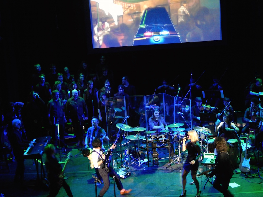 The concert began with two standards from the Video Game Orchestra’s set list. The opening piece was the “Main Theme” from Street Fighter 2, originally written by Yoko Shimomura, followed immediately by the “Main Theme” from Chrono Trigger. Both of these pieces I’ve heard live with just the rock ensemble, so it was interesting to hear the alterations made to include the choir and string section. Most of these additions involved the extra sections simply supporting the harmonies already being played by the rhythm guitar and other accompaniment instruments. They were minor adjustments, but it added to the overall power of the group’s sound.